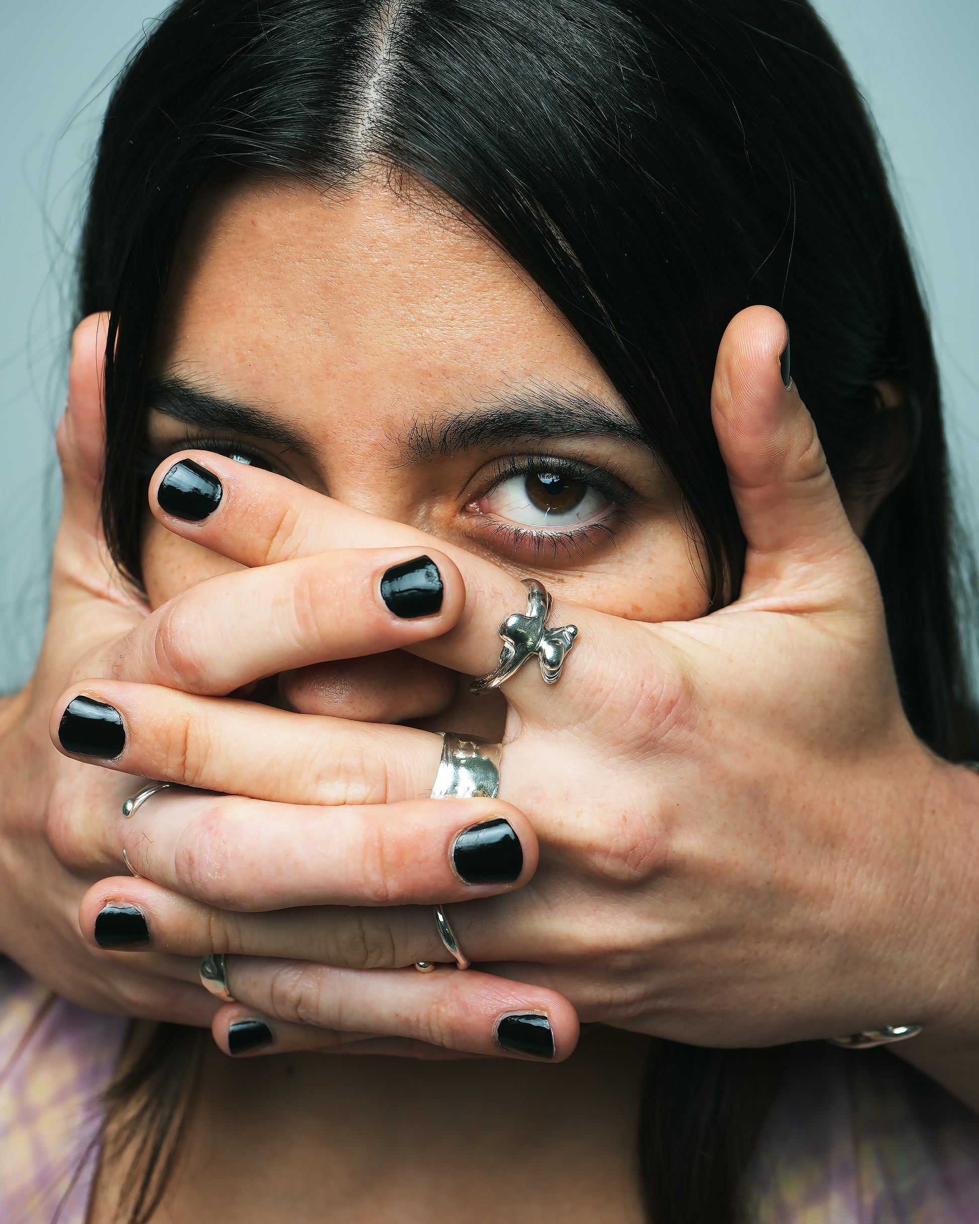 Una pieza de líneas libres y forma impredecible. Su volumen central, de inspiración orgánica, captura el espíritu más artístico de Bibbe: la materia en movimiento, el equilibrio entre gesto y pausa. Fundido en plata esterlina, cada curva refleja una interpretación distinta de la fluidez, convirtiendo este anillo en una pequeña escultura para llevar puesta.