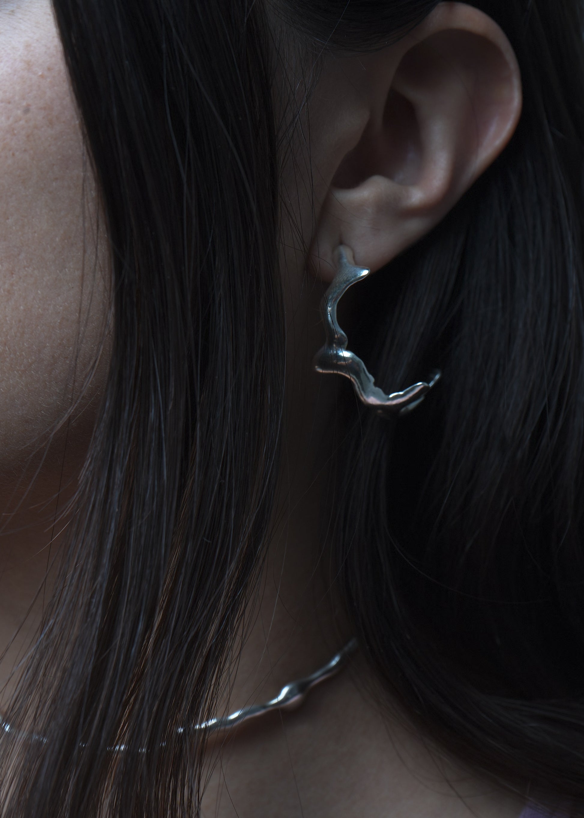 De tamaño medio y realizados en plata esterlina, los Aros Crown forman parte de una rama especial dentro de la colección Bibbe. Su silueta se define por un juego de picos que suben y bajan, recordando a la forma de una corona. Una pieza con presencia y carácter, que combina fuerza y delicadeza en equilibrio.