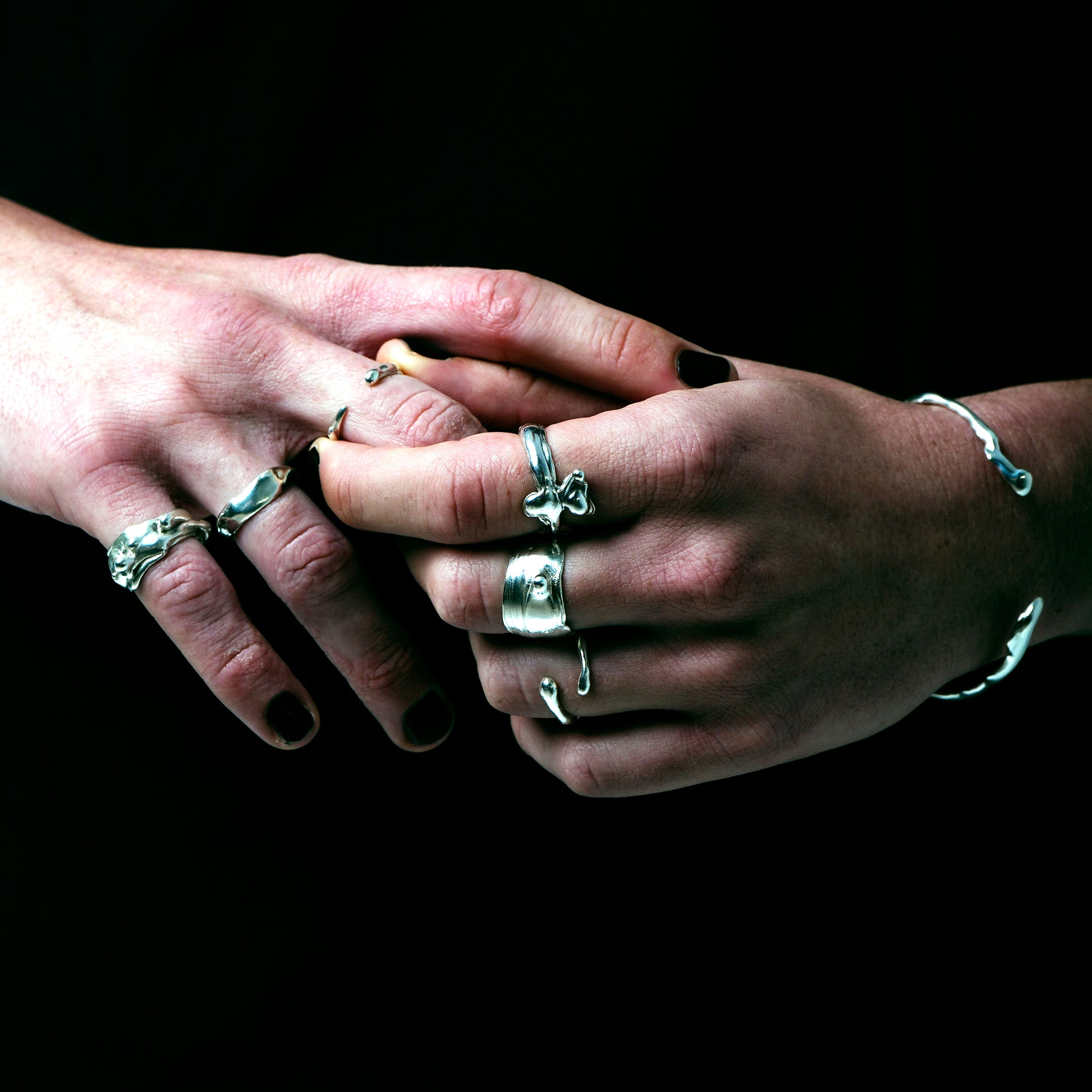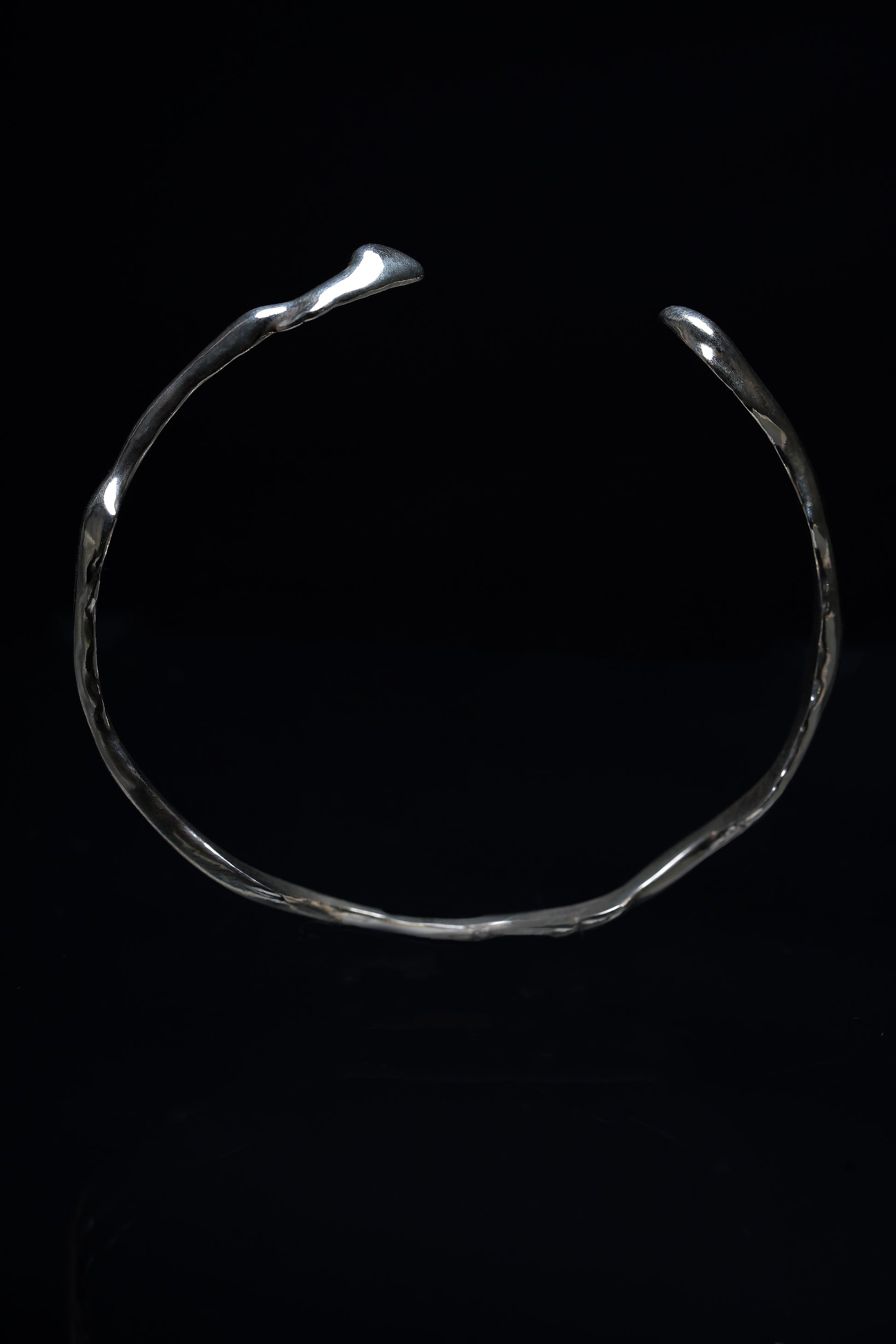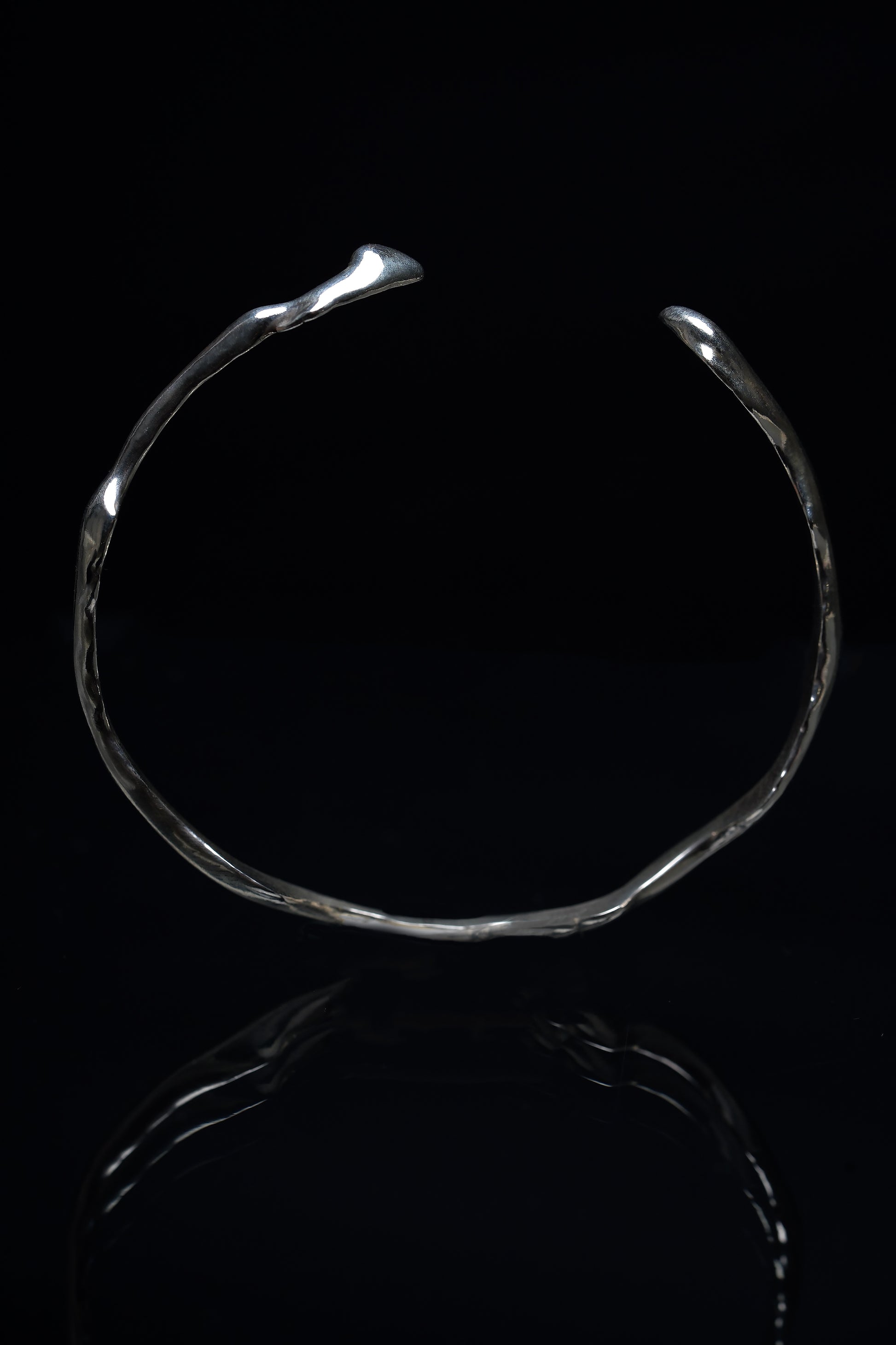 La pieza más esencial de la colección. Un brazalete rígido en plata esterlina que concentra la esencia de Bibbe en una forma limpia y fluida. Su diseño unisex abraza la curva de la muñeca con naturalidad, jugando con la luz y la textura sin perder sobriedad. Una joya que equilibra fuerza y sutileza, materia y movimiento.