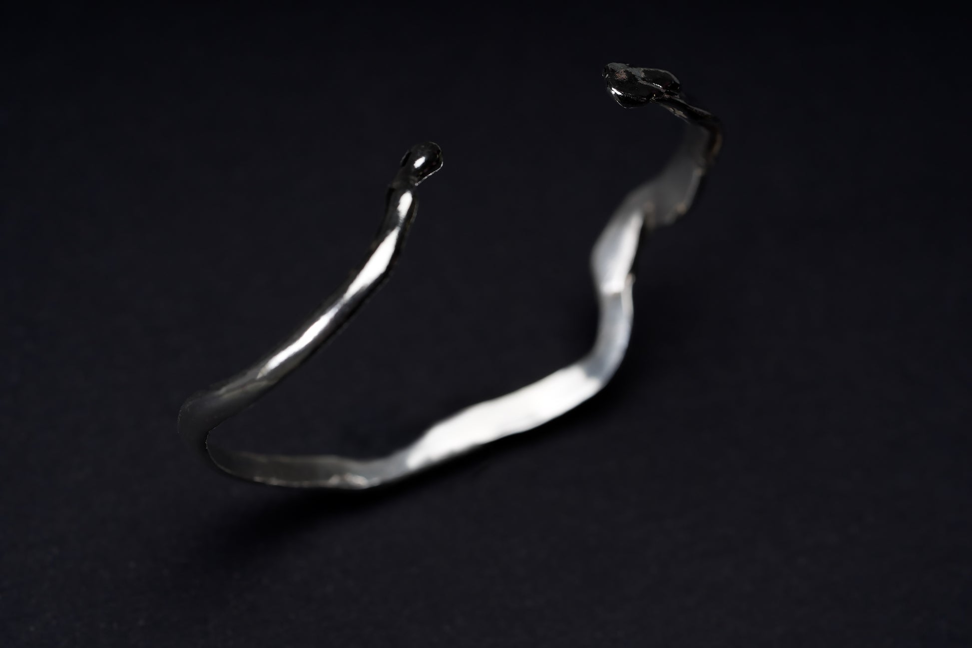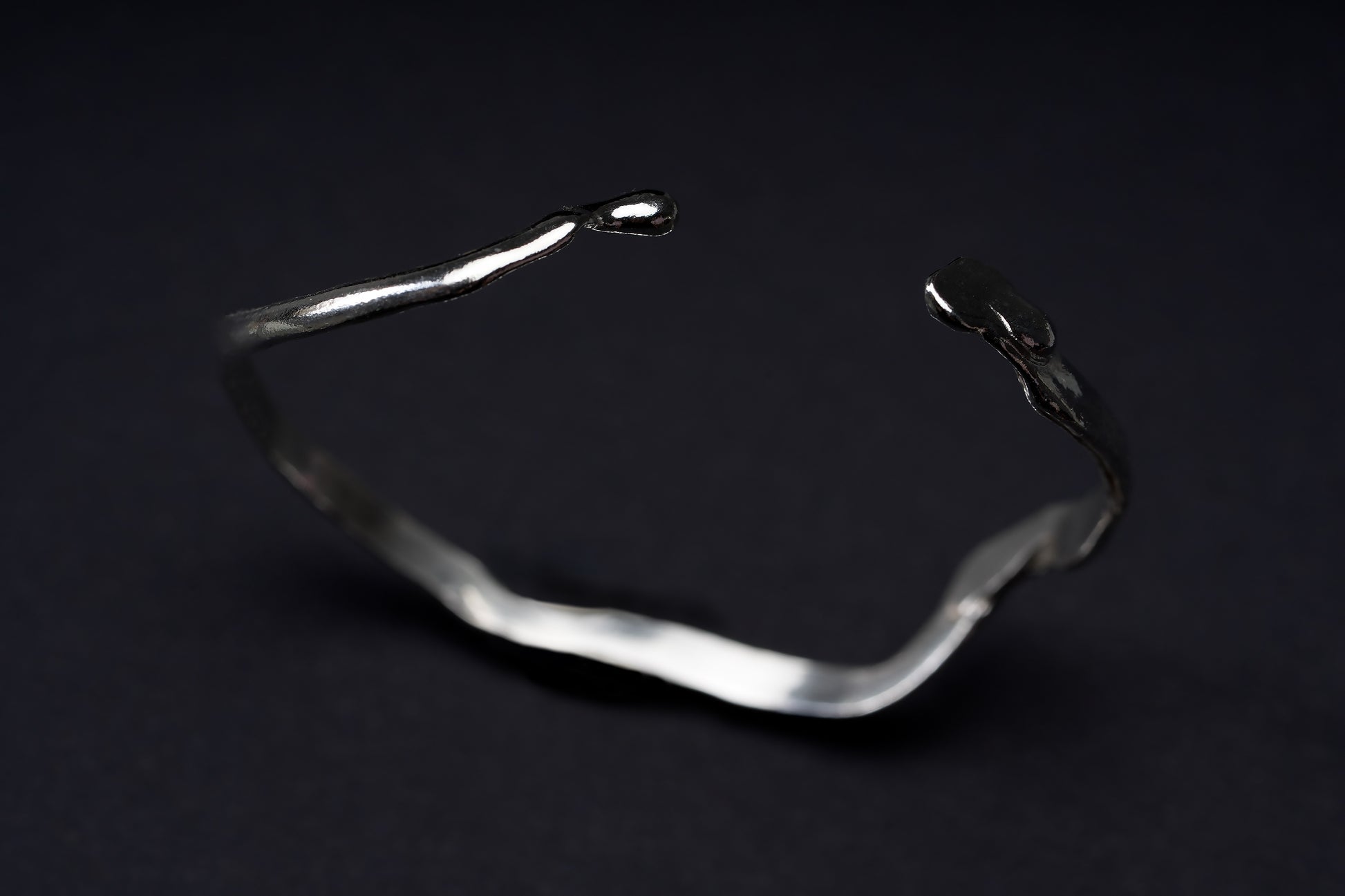 Una interpretación ligera de la forma orgánica de Bibbe. Este brazalete rígido en plata esterlina traza una línea sutil y continua que envuelve la muñeca con elegancia natural. Su perfil más fino conserva la fluidez característica de la colección, ofreciendo una versión delicada y versátil, ideal para el día a día o para combinar con otras piezas.