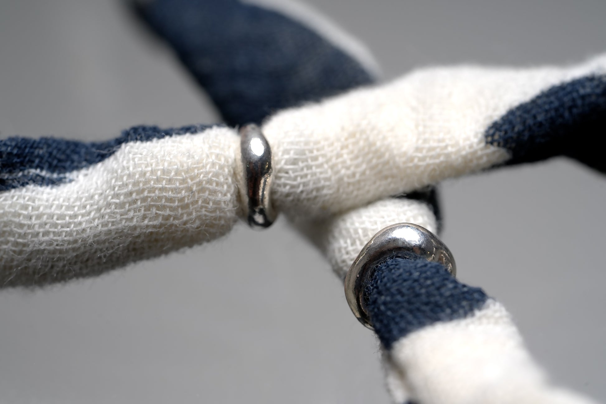 El cordón está trabajado con nudos simétricos —cinco a cada lado— y dos charms Bibbe, uno a cada lado del colgante central y entre los dos primeros nudos. Puede anudarse o cruzarse, ofreciendo diferentes formas de llevarlo según el momento.
