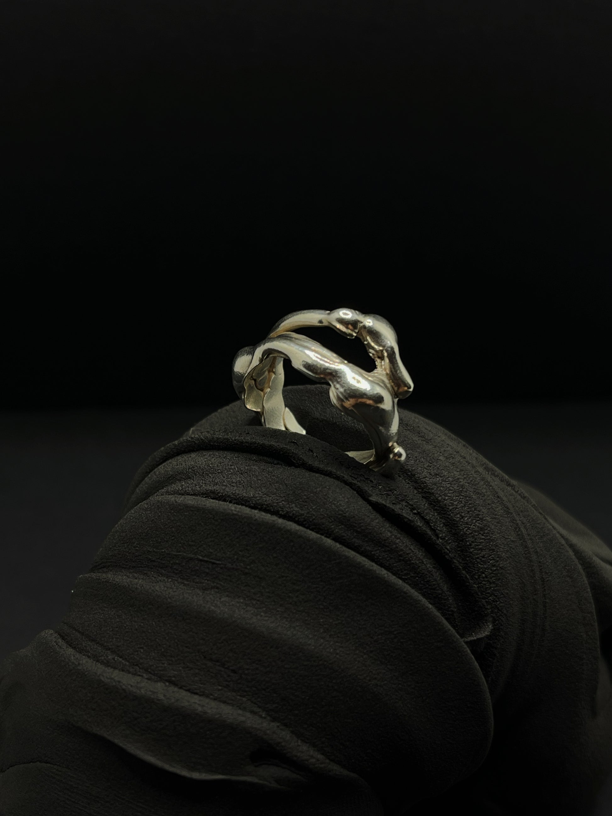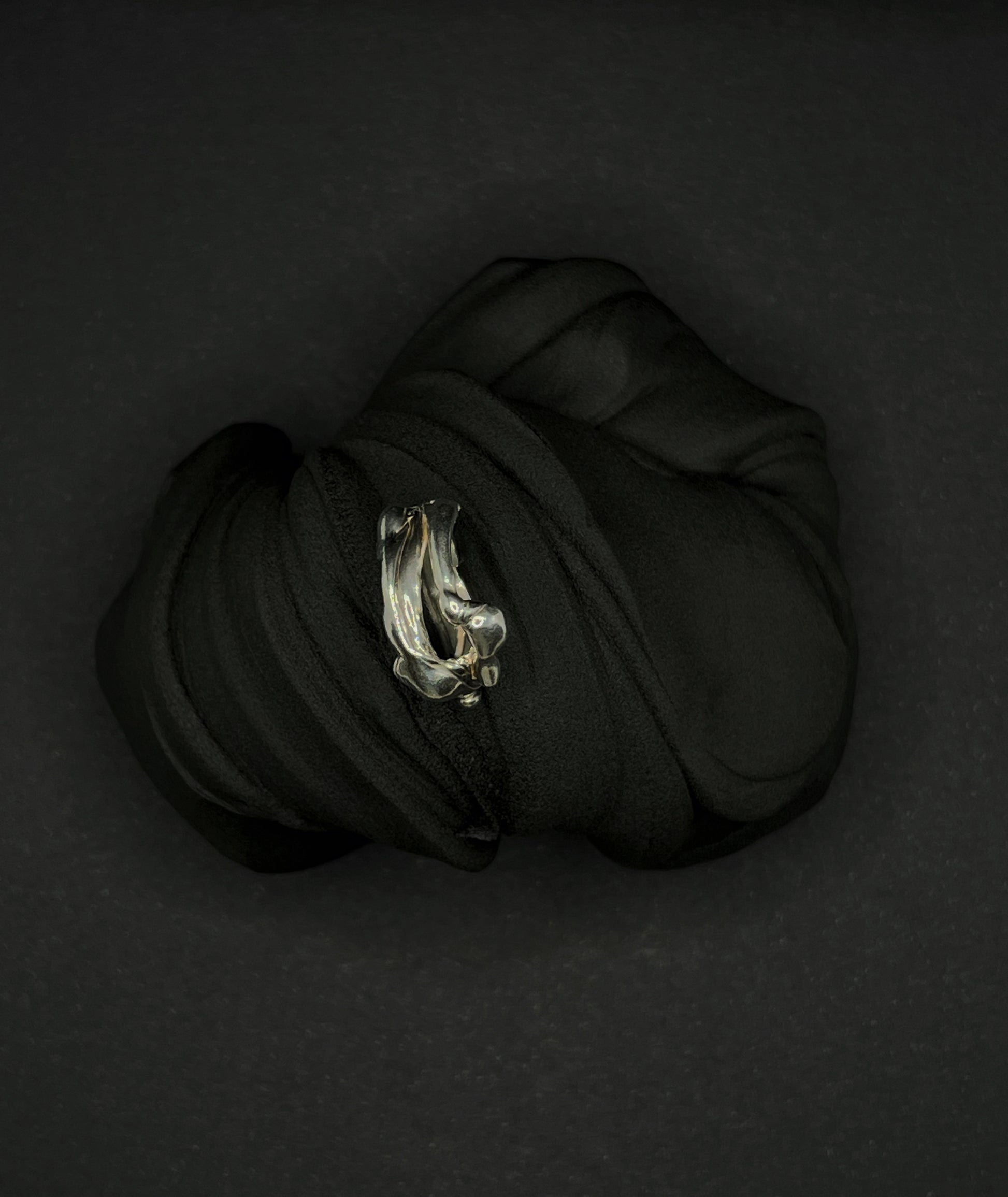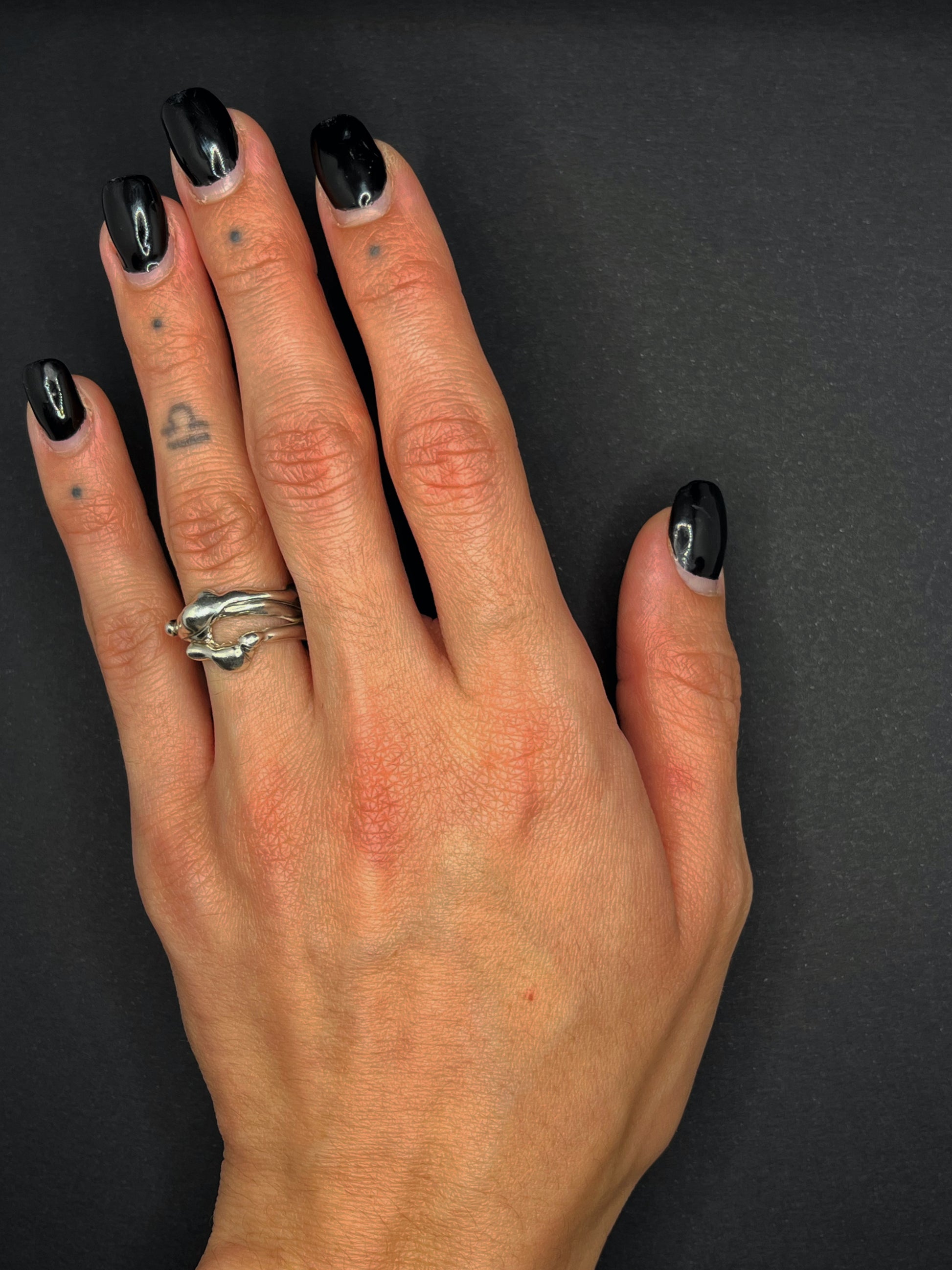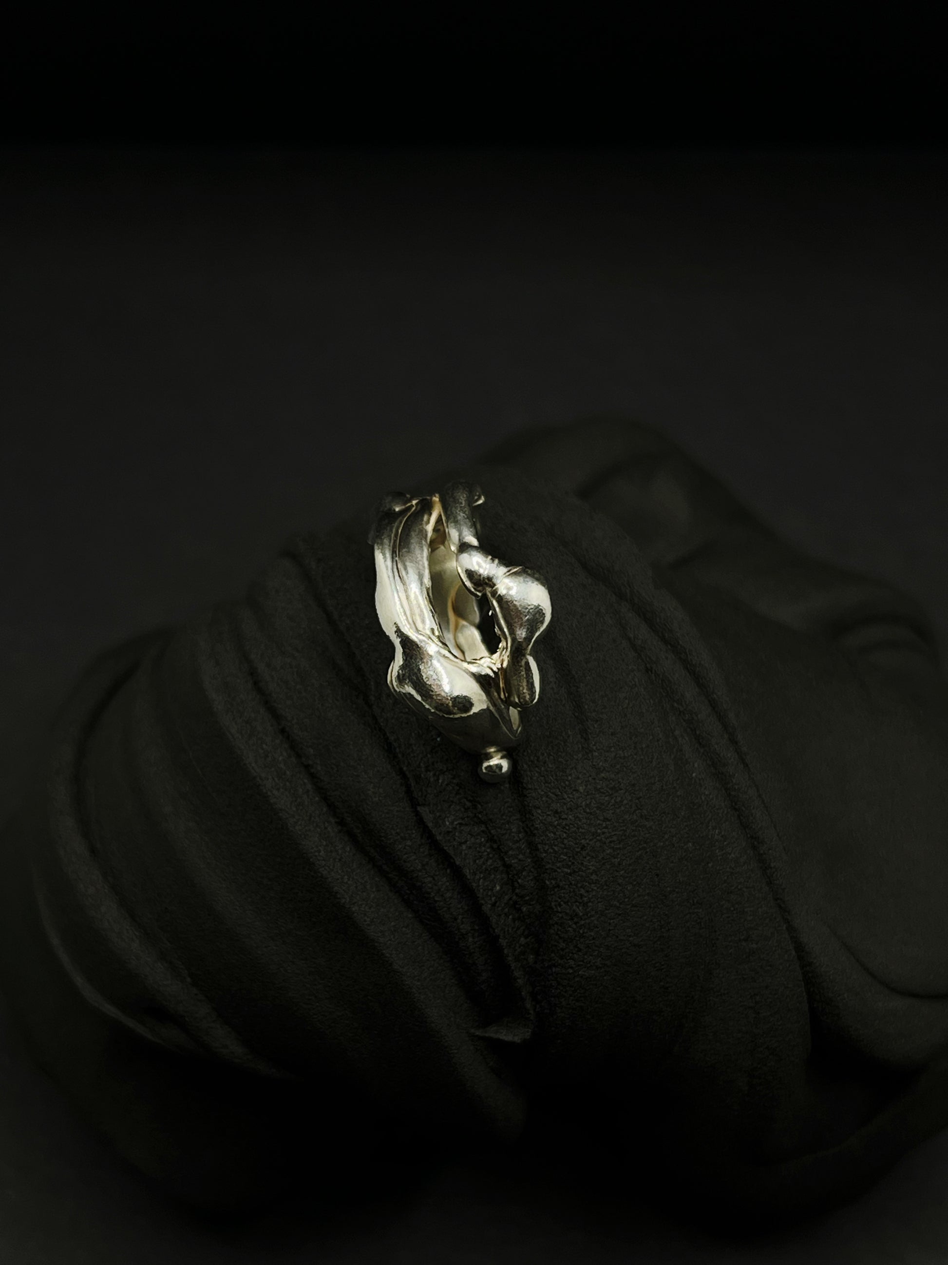 Un anillo que parece surgir del movimiento mismo. Su superficie está formada por pequeñas gotas que se entrelazan y se cruzan, dejando un vacío central donde la forma respira. Fundido en plata esterlina, el Drops Droplets Ring explora el equilibrio entre lleno y vacío, peso y ligereza, como si la materia se detuviera justo antes de caer.