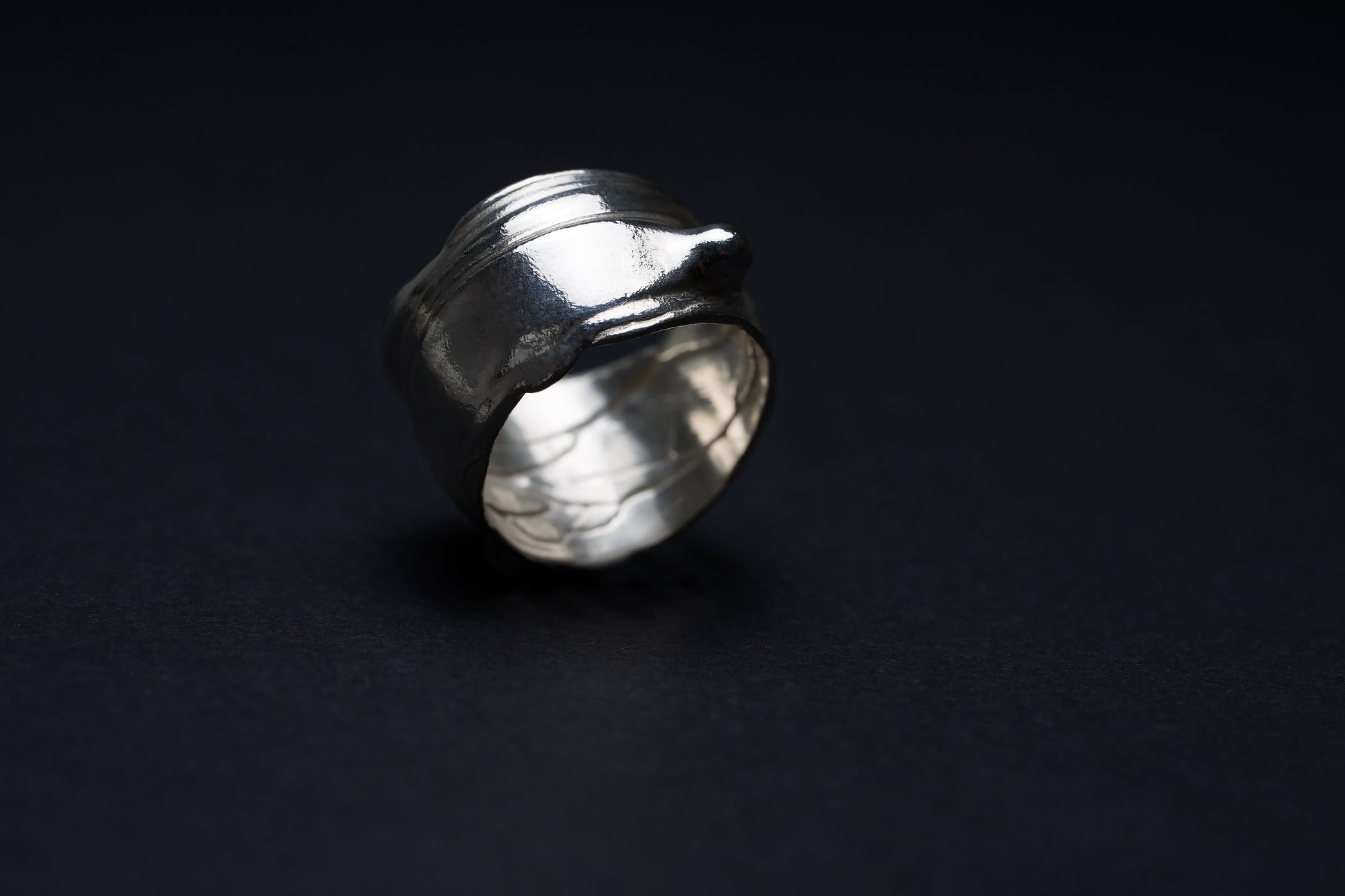 Un anillo ancho que conserva las huellas de su creación. Las capas que antes fueron cera hoy son plata, revelando el rastro del proceso en su superficie. En el centro, una gota se eleva, como suspendida en el tiempo.